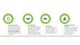 The donation campaign is organized under the umbrella of the German-Ukrainian Energy Partnership on behalf of the BMWE. The German-Ukrainian Energy Partnership is being by the Deutsche Gesellschaft für internationale Zusammenarbeit (GIZ). For the implementation of the donation campaign, GIZ cooperates with the Ukrainian NGO "Go Local". In close exchange with GIZ, Go Local supports the Ukrainian Ministry of Energy in matching donation offers and handles transport from the Ukrainian border.